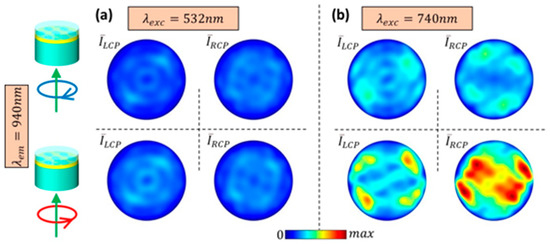 For each of simulations presented in Figure 7, we save the intensities of each field component in the points defined in the inset of Figure 1b. As was expected for the confinement with plasmonic nanohole arrays, the main field component for each excitation was (not shown here); this means that the z-oriented dipoles standing on the nanohole rims will enter the sum in Equation (4), with significantly higher weight. Next, we calculated the LCP and RCP light emission by averaging all dipole positions and orientations with this additional weight factor from the passive simulations, thus accounting for the excitation electric field intensity at the position of the dipoles. To demonstrate strong influence of the excitation on both intensity and chirality of emission, we investigated how light emitted at depends on the excitation wavelengths and , and on the choice of RCP and LCP, as shown in Figure 8. Since the results are plotted with the same color bar, we note a strong enhancement in the case of LCP excitation at 740 nm. This is a consequence of the high field confinement at the position of the dipole ensemble, as seen in Figure 7b. The emission intensities are ~5 times lower for the excitation at 532 nm, compared to 740 nm, while the resulting emitted field distribution shows distinguishable behavior. Namely, at 532 nm excitation, we notice a slight enhancement of both and when its handedness is switched from RCP to LCP, as seen in Figure 8a. At 740 nm excitation, the LCP and RCP emitted components drastically change in distribution and increase in intensity from the excitation change from RCP to LCP, as seen in Figure 8b. This is because the Au-ENHA is strongly chiral at this excitation wavelength, with a pronounced change of the electromagnetic confinement over the ensemble (see the xy cross-sections in Figure 7b).