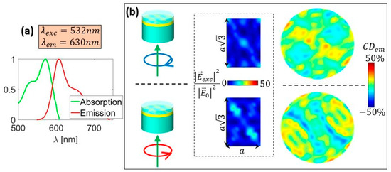 (a) Typical absorption and emission spectra for Lumogen Red dye [45]. (b) CDem for RCP (top) and LCP (bottom) excitations of Ag-ENHA excited at and emitting at ; the inset shows the xy cross-sections of the electric field intensity, as in Figure 7.