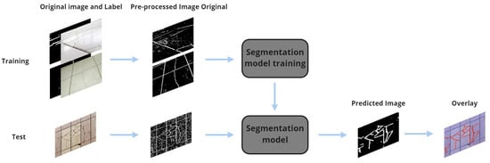This work presents an architecture for segmenting cracks in facades with Deep Learning that was named the CCS model (Segmentation Model for cracks in ceramics) that includes a pre-processing step and a deep neural network for segmentation proposal followed by a threshold operation, as shown in Figure 1. The output is a binary image that brings white lines where the cracks were located, and, through overlapping images, it is possible to highlight the cracks in the original image. At CCS, pre-processing is done in the database before using the segmentation model. The pre-processed image with its label is adopted as input to perform the model’s training. After training, only the original image is needed to run this network.