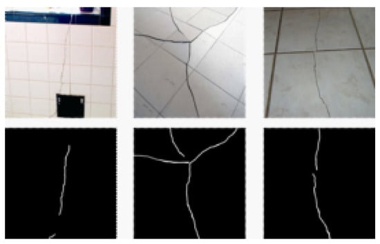 We propose a ceramic crack database with 167 ceramic crack images. The images were collected by students of the University of Pernambuco from the civil engineering department. The database consists of images of a fixed resolution of 256 × 256 in RGB format without any pre-processing. Each element is labeled with a binary image of segmented cracks. The data has various characteristics, like different sizes, angles, illumination, distances, or even materials and textures. The database has images of building facades with ceramics with cracks of different shapes, both superficial and more profound. Besides, the database has images of ceramics with different colors and textures, which enrich its diversity and give more information to the model used. Figure 3 shows examples of the database images, the first line (up) shows the original images resize by 256 × 256, and the second line (down) shows the respective segmented label.