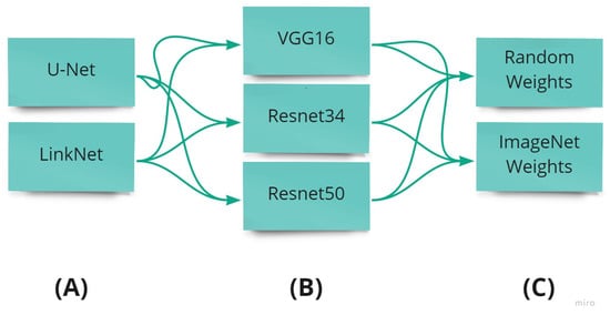 The used architecture, backbone, and weight initialization method are illustrated in Figure 5. The backbone is the network architecture implemented in each model. In this work, we use the different architectures like resnet34 [22], resnet50 [22] and vgg16 [19], which are 34 layers deep, 50 layers deep and 16 layers of deep, respectively. The initialization of the weights is carried out randomly and using the weights of the pre-trained neural network with the ImageNet database [23].