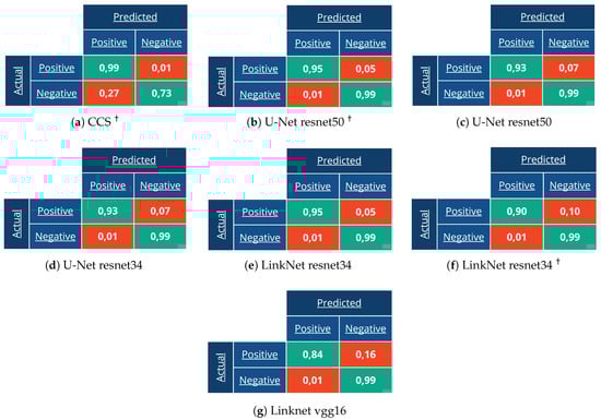 Confusion matrix from the prediction to (a–d) U-Net model, where (a) is CCS model, (e–g) LinkNet model. The weights of a pre-trained network with ImageNet are used to initialize each of the models (For the models , weights were randomly initialized).