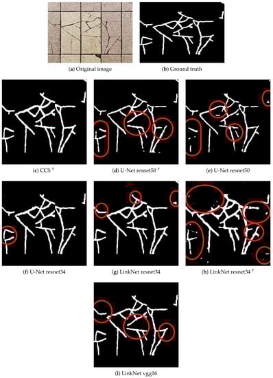 Qualitative analysis can be illustrated with the results presented in Figure 7. The Figure shows an example image (Figure 7a) and its ground truth (Figure 7b). The original image is inputted to the network, having the expected output (Figure 7c–i). It is possible to observe mistakes in segmentation labeling in some regions. Figure 7c,h shows a thick segmentation in comparison with the other predictions, overestimating the region where the crack is. A fine segmentation can lose crack representation. In Figure 7e, some parts of the crack are not identified. It should be noted that the models above can segment the cracks that are above or near the grouts. In some IPTs, such as fissures, they are easily confused with grouts. During the training, some analyses were made, and it was observed that by increasing the number of epochs in the training, the model was able to learn more, including understanding when the cracks were overlapping in the grout reducing the problem of not identifying cracks near or overlapping the grout.