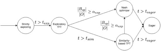 The representation of the finite state machine is shown in Figure 1, and the state transition rules can be explained as follows. In the beginning, our agent aims to get to know its opponent from the bid exchanges. The goal is obtaining knowledge to use in the rest of the negotiation. Therefore, the initial negotiation behavior is Strictly Exploring, which is employed until a strict exploration time threshold ( is surpassed. After the strict exploration phase, the agent may have learned to some extent about its opponent’s preferences, but it may be the case that the learned model is not reliable yet to accurately estimate the bids maximizing the social welfare. In that case, until receiving a certain proportion of unique bids (), the agent employs a Exploratory Tit-For-Tat behavior. Whenever the agent receives the specified proportion of unique bids, the agent’s negotiation behavior turns to be Nash Optimizer. In that behavior, the estimated Nash product bid is offered. If the negotiation time surpasses the time threshold () and the proportion of unique bids is not received, the Similarity-Based Tit-For-Tat behavior is followed. During this phase, the agent may transit to Nash Optimizer as it receives enough bids. The final behavior Eager, occurs only when the negotiation time approaches the deadline ().