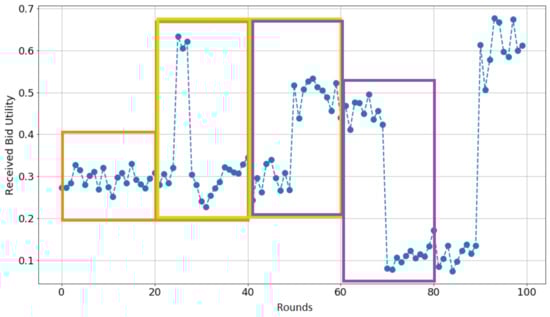 The proposed agent employs non-sliding windows of bids in many of its components. In general, the negotiation history is split into disjoint and successive windows of bids received from the opponent. These windows can contain at most k bids. The most recent window may contain less than k bids as it is filled with new offers received from the opponent. Both Figure 2 and Figure 3 contain examples of this concept. On the one hand, Figure 2 is an example of a sequence of received bids by an opponent. The horizontal axis shows the negotiation rounds while the vertical axis denotes the received utility of the opponent’s bids at each round. Each bid window is shown by colored rectangles. One may think of windows as consecutive slices of received bids. In this figure, there are four completed windows of offers and one that is currently being filled with opponent offers (the last one to the right). On the other hand, Figure 3 shows a conceptual example with offers and three complete bid windows, and one that is currently being filled at .