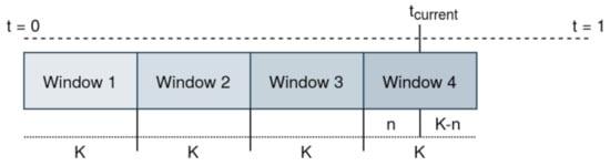 In the new Tit-for-Tat concession mechanism, the agent considers the most recent complete window pairs, and (just filled), in the history of bid windows . If we consider an example with , the concession mechanism would work with two consecutive windows of bids of size . In this example, one can formulate the current window of bids as = [, ..., ], where t is current time step and denotes the offer sent by the opponent at round i. For instance, the agent would take into account Window 2 and Window 3 at for the given example in Figure 3. Only when the current window is filled with k bids is the concession mechanism executed again. Therefore, the concession and update of the target utility occur in window-sized mini-batches. After the update, the current window is added to the history of previous bid windows, and it is emptied to start a new bid window.
