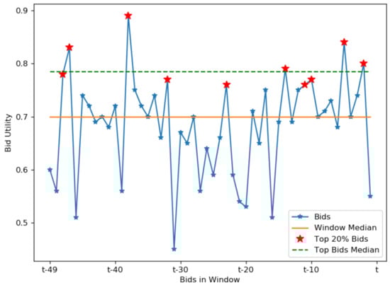 The first steps (lines 1–4) consist of estimating a central measure of utility received from the opponent in the current window of bids. For that, bids in a window first need to be transformed to a utility space. The agent uses a median utility calculation mechanism as a measure of centrality due to the abrupt and unintended changes in utilities of bids sent by the opponent. In fact, instead of considering the whole window of bids, we propose for the agent to just consider those offers whose utility are above a given percentile (i.e., , with z being the specific percentile). We experimentally found that many windows of bids only contain a few reasonable offers for the agent even though the opponent may have conceded. In some scenarios, this is caused by inaccurate opponent models in the early and middle stages and, in others, just due to the exploratory nature of the opponent. Therefore, we believe that concessions should only be detected with the top offers from the window of bids rather than just two consecutive offers or from the whole set of offers, as proposed by classic Tit-for-Tat variants. After filtering out those offers above the percentile in the windows of bids, its median is calculated. From this point on, we refer to this median calculation on the top bids in a window as the top median. Figure 4 shows a bid window collected from a real negotiation and illustrates how calculating the median on the offers above a given percentile (, 20% top offers) may better represent concessions carried out by the opponent.