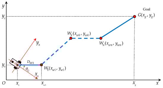 In Figure 1, the differential drive wheeled mobile robot tracks the optimal path connecting the waypoints from the starting point (x0, y0) to the goal G(xg, yg) through several waypoints Wk(xwk, ywk), k = 2, 3, …, n − 1. (n is the total number of waypoints). The waypoints are determined by the planning layer of the robot (using the supervisory controller).