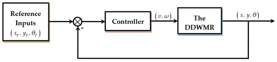 The Differential Drive Wheeled Mobile Robot (DDWMR) can perform many different tasks in many fields. To fulfill its series of tasks in different places, the robot has to move from one place to another place in a known or an unknown environment. Therefore, motion control problems such as path tracking, “go-to-goal”, “point-to-point”, waypoints tracking, pose tracking, etc. of a mobile robot are still the crucial and fundamental problems for the robot operation. These control problems have been widely researched and published, such as the obstacle avoidance with minimum travel time [1], the go-to-goal control without obstacle avoidance [2,3], the leader following control [4], the trajectory tracking control [5,6,7], the wall-following control [8], the obstacle avoidance [9,10,11]. For the robot motion control, both conventional control methods and modern control methods have been applied. Several well-known controllers such as the controller proposed by Kanayama and Robins Mathew, the feedback-based controller for the circular path, the Lyapunov-based controller, the clever trigonometry-based controller, and the Dubins path-based controller, have been discussed in [12].