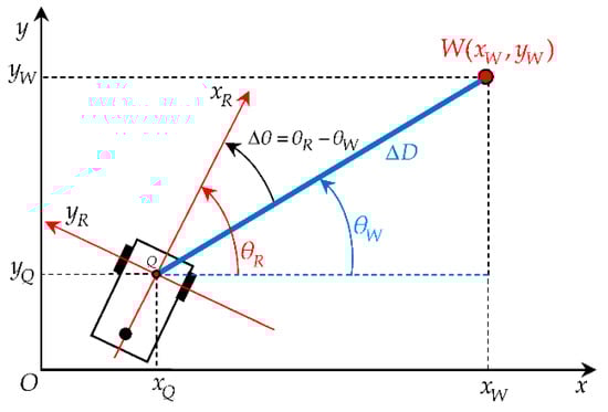 The movement of the differential drive wheeled mobile robot heading to the waypoint (W) is depicted in Figure 4.