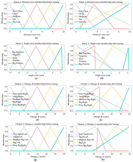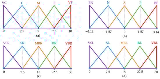 (a) The membership functions of the distance error; (b) The membership functions of the angle error; (c) The membership functions of the right wheel angular velocity; (d) The membership functions of the left wheel angular velocity.