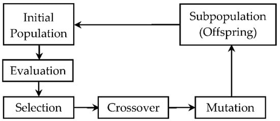 A typical GA cycle is shown in Figure 8. The GA is based on following operations: selection, genetic operations (crossover, mutation), and replacement [20,32,34,35].