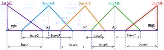 In Figure 9, the (min, base1) is the set of parameters defining the 1st Membership Function (MF), the (base2, A1, base3) is the set of parameters defining the 2nd MF, the (base4, A2, base5) is the set of parameters defining the 3rd MF, the (base6, A3, base7) is the set of parameters defining the 4th MF, and the (base8, max) is the set of parameters defining the 5th MF. Thus, there is a total 11 parameters (base1, base2, A1, base3, …, A3, base7, base8). Here, min and max are the minimum and the maximum of the universe of discourse, respectively. A1–A3 and base1-base8 can take any value in the range [min; max] with the constraint (min < A1 < A2 < A3 < max).