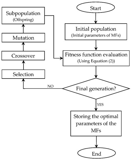 The “Tuning process (Genetic Algorithm)” block in Figure 10 are executed by the flow chart of the genetic algorithm depicted in Figure 11 as follows.