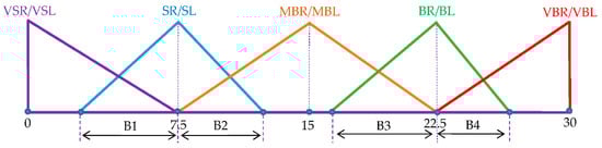 Many types of the MFs have been used in fuzzy logic control systems, such as a triangular function, a trapezoidal function, a Gaussian function, etc. In the WMR field, the triangular and trapezoidal functions are applied more often than others [36]. Thus, in this study, the triangular function is selected to represent the MFs of the FLC because the triangular function is determined by just three parameters. Also, its evaluation is quite cheap, and the main advantage of the triangular function is the possibility to define it fully by just three parameters. Such a low number of parameters helps to lower the dimensionality of the optimization problem.