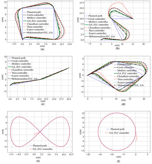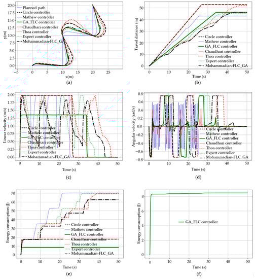 Besides, Figure 13a and Table 11 show that when controlling the differential drive wheeled mobile robot by the GA_FLC, the tracking error is quite small. This error is the smallest in all, except the error tracking of the robot when it is controlled by the Mathew_based controller. Furthermore, Figure 13e,f also indicate that the energy consumption of the DDWMR when it is controlled by GA_FLC is the smallest and it increases insignificantly from about 2 s to 40 s.