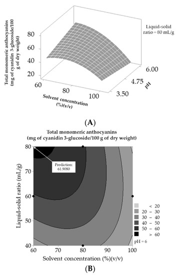 | Solvent Concentration (%) (v/v) | pH | Temperature (°C) | Time (min) | Liquid–Solid Ratio (mL/g) | Total Monomeric Anthocyanins (mg C3G/100 g DW) |