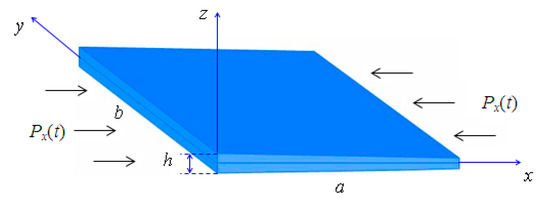 Here, and are the normal forces per unit length; is the shear force; and are the bending moments, is the torque moment; and are the in-plane loads per unit area; is the normal distributed load per unit area; is the compressive force per unit length applied to the plate edge; is the density of the material; and , , and are the components of the displacement vector in the directions of the axes , , and , respectively. The compressive force is applied to the side of dimension and is a function of time according to the law , where is the constant part of the load, is the amplitude of the variable part, and is the frequency of the load pulsations.