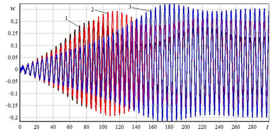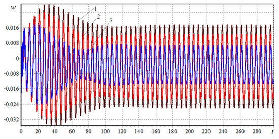 Figure 6 shows the change in the deflection of a viscoelastic plate as a function of time for different values of the thickness variability parameter at λ = 1, δ = 25, Aij = 0.05, w0 = 0.01, δ0 = 0.3, δ1 = 0.5, θ = 1.1, Δ = 1.2, μ1 = 0.32, μ2 = 0.27, and g = 0.3833. It is seen that an increase in this parameter, i.e., a decrease in the plate’s stiffness, leads to a decrease in the vibration amplitude.