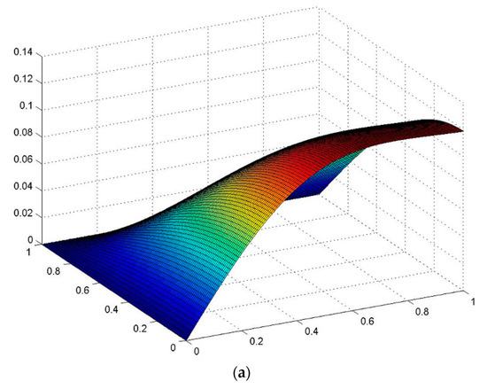 Vibration form of a rectangular plate of variable thickness at t = 78: (a) elastic at Aij = 0; (b) viscoelastic at Aij = 0.05.