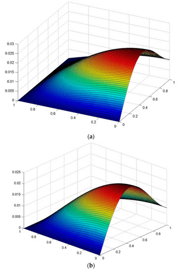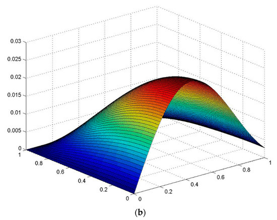 Vibration form of a rectangular plate at t = 130: (a) = 0; (b) = 0.3.