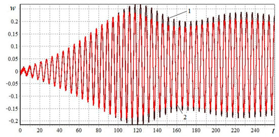 Dependence of the deflection on time: (1) Aij = 0.02, ⊗ = 1.1; (2) Aij = 0.02, ⊗ = 1.3.