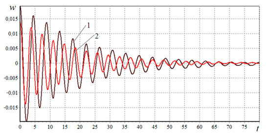 Figure 4 shows the effect of inhomogeneous material properties of a viscoelastic plate on deflection at λ = 1, δ = 25, α* = 0.3, w0 = 0.01, δ0 = 0.3, δ1 = 0.5, θ = 1.1, μ1 = 0.32, μ2 = 0.27, and g = 0.3833. Here, curve 1 is in the setting of the viscoelastic properties only along the shear directions, and curve 2 is in the setting of the viscoelastic properties in all directions. The results show that taking into account the plate material’s inhomogeneous properties leads to decreased vibration amplitude.