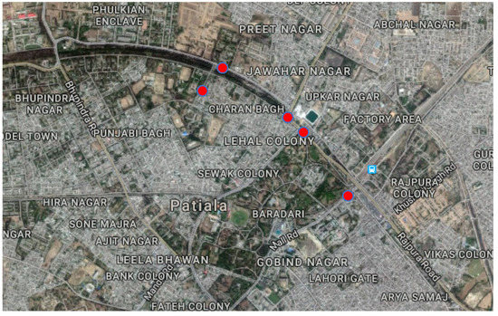 The data used in this paper has been collected on the busy urban roads of the Patiala city in India (Figure 1). Besides the equivalent continuous sound pressure level (Leq), the data collection included the parameters traffic volume (Q), percentage of heavy vehicles (P) and total honking occurrences (H) that have been used to calibrate and test the machine learning models. These parameters have been collected manually using videography at five different identified sites, highlighted in Figure 1, on the basis of congestion, presence of honking noise and proximity to resident population. For each video, the numbers of light and heavy vehicles have been annotated, as well as the number of honks in each 15 min measurement.