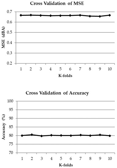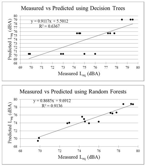 Results of the models’ predictions plotted versus measured equivalent levels in the validation and training datasets are shown in Figure 4. It is easy to see that apart from decision trees (DT) that in 4 points is very far from the measured Leq, all the models’ results are gathered almost close to the bisector, meaning a general effectiveness of the proposed models. When the measured Leq are around 70 dBA (site 2), the models have the best performances. This site is characterized by absence of heavy vehicles and honking frequencies lower than in the other sites. Data above 78 dBA are related to site 4, in which the traffic flows are higher than in the other sites.