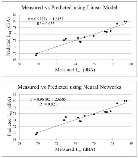 Scatter plots between measured and predicted values of Leq.