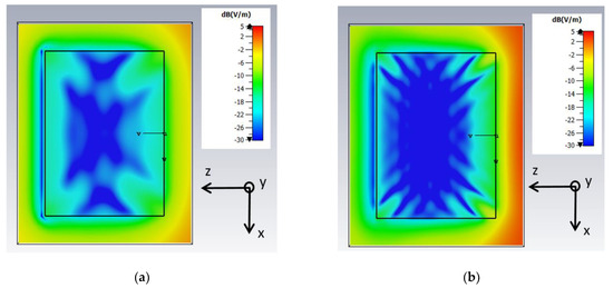 Top view (355 mm × 255 mm) of simulated electric field distribution of a 355 mm × 160 mm × 255 mm trunk phantom model: (a) f = 402 MHz, (b) f = 868 MHz, (c) f = 2.45 GHz and (d) f = 5.8 GHz.