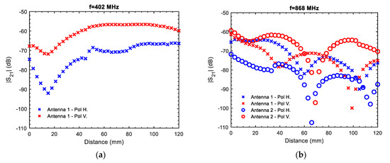 S21 dB vs. distance for the different antennas and polarizations: (a) f = 402 MHz, (b) f = 868 MHz, (c) f = 2.45 GHz and (d) f = 5.8 GHz.
