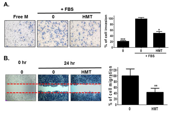 PC-3 cells (1 × 106 cells/mL) were seeded in a 6-well plate and incubated at 37 °C. When the cells reached 50% confluence, they were scratched with a 200 μL pipette tip, followed by washing with PBS. The cells were then treated with 50 μg/mL of HMT in a complete medium for 24 h. After incubation, cells were fixed and stained with Diff-Quick. Randomly chosen fields were photographed under a microscope (Nikon, Tokyo, Japan). The number of cells that migrated into the scratched area was calculated.