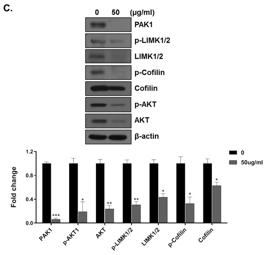 Cancer cell migration is a fundamental process in solid tumor formation and is required for metastasis formation [7]. The formation of cancer metastasis, which includes cancer cell migration and invasion, involves changes in cytoskeletal signaling pathways, increased motility, and enhanced cell survival. Thus, the actin cytoskeleton is an important factor in tumor cell migration and invasion [8]. It has been reported that PAKs regulate the actin cytoskeleton during cell motility and invasion [9]. The phosphorylation of both LIMK and cofilin is greatly enhanced in the presence of active PAK [10,11,12,13]. Furthermore, the expression and activity of LIMK are higher in invasive breast and prostate cancer cell lines than in less invasive lines [14]. In addition, PAK-1 plays an essential role in cell growth, adhesion, migration, and survival in colorectal cancer [15] and lung adenocarcinoma [16], through the activation of AKT, ERK, and β-catenin.