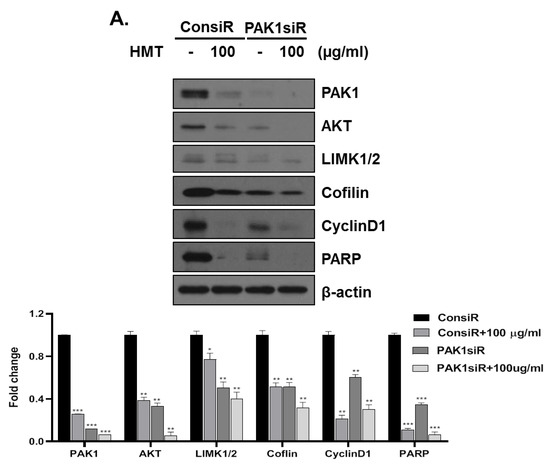 Recent studies have shown that there are several possible links between PAK and PI3K and Raf–MAPK pathways [5,36,37,38]. To confirm the involvement of PAK-1 in the HMT-mediated anticancer effect, we evaluated expression changes of proteins involved in the PAK-1 pathway by knocking down PAK-1 with siRNA. As shown in Figure 4, knockdown of PAK-1 by siRNA reduced the expression of the G1-regulatory protein cyclin D1, LIMK1/2, and cofilin and induced expression of the apoptotic protein cleaved caspase-3. Furthermore, this knockdown enhanced the HMT-mediated anticancer effects by inhibiting the PAK-1/AKT pathway. Consistently with our data, PAK-1 inhibition using shRNA or siRNA strategies induced apoptosis and CDK4/6 inhibition [39,40,41].