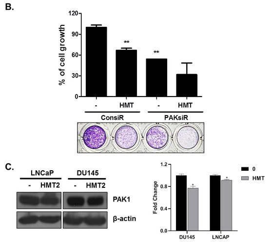 The PAK-1 siRNA and control siRNA were purchased from Bioneer. To transfect the siRNAs, PC-3 cells were seeded at a density of 5 × 104 cells per well in a 6-well plate. Cells were transfected using 100 nM of either the PAK-1 siRNA or the control siRNA with a siRNA transfection reagent (Polyplus) for 48 h. After treatment, cells were stimulated with HMT and then analyzed with Western blotting assay and stained with crystal violet. The O.D. was measured by a microplate reader (Tecan, Sunrise, Switzerland) at 570 nm, with a reference filter at 405 nm.