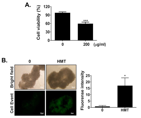 Inhibitory effect of HMT on 3D culture PC-3 tumor organoid growth. Five days after spheroid formation, the formed spheroids were treated with 200 μg/mL HMT for 48 h. Six organoids per group were used. (A) For organoid viability, the CELLOMAX viability kit was added to each well and reacted for 18 h. Data represent mean ± SD. * p < 0.05, ** p < 0.01, and *** p < 0.001 compared with control. (B) For apoptosis analysis, 2 μM CellEvent (Invitrogen, USA) was added to each well and reacted for 1 h. Pictures were obtained using a fluorescence microscope (Nikon, Tokyo, Japan).