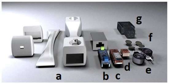 Shaders prototype and their components: (a) controller case, (b) Arduino, (c) Instrumentation Amplifier (AD627), (d) IMU sensor, (e) force sensors, (f) Interlink FSR sensor, and (g) battery.