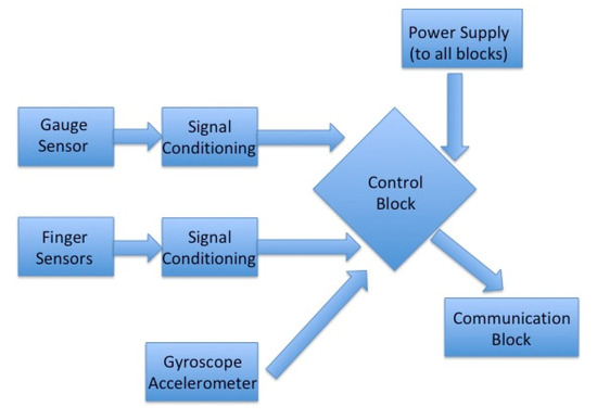 - Sensors: This block contains a gauge that measures the force made by the user’s hand; four sensors are able to detect the pressure of the fingers; a gyroscope and an accelerometer measures hand movements (velocity and acceleration) in order to detect user’s tremors.