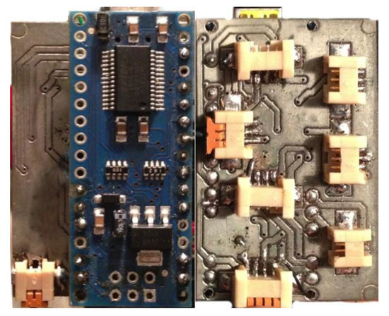 The microcontroller considered in the control block is the ATmega328. A PCB Arduino Nano, which contains the ATmega328 microcontroller, has been used. This platform has 8 analog inputs, which are enough to read the voltage values of the analog outputs of sensors.