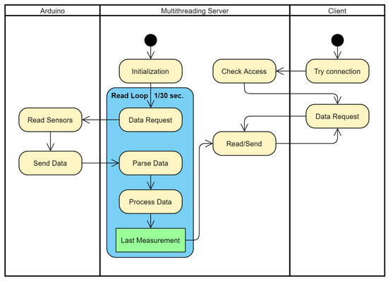 The server has been implemented using multithreading. One thread is in charge of communication with Arduino: data request, parsing, processing and storing. At the same time, it receives client’s requests. For each client, a thread is created. Figure 5 shows a simplified UML Communication Diagram between Arduino, server and client.