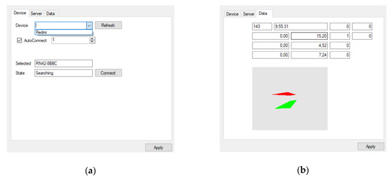 (a) Tab that provides the user with a list of available devices. (b) Tab that provides the user with data obtained from service.