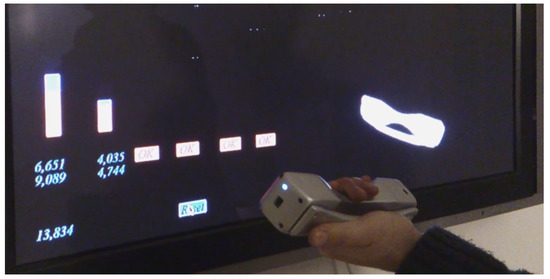 In this section, the main results of the work are presented. First of all, an example of execution of the testing application in Figure 7 and Figure 8. In this example, all parameters of the device are visualized in the screen. The force visual feedback given to the user includes force done and finger sensors activation. The virtual object changes position and orientation depending on hand and force values. In order to include visual variation of force sensors, a timeline is also provided. Furthermore, in every medical rehabilitation therapy the visual feedback will be adapted to specific objectives. An introductory video showing device performance is available online as additional information (http://ugivia.uib.es/video/ (accessed on 28 June 2021) or see Supplementary Materials). As a security measure, and in order to avoid the dropping or throwing of the device, a “velcro” band (similar to those in Valve Index Controllers) is included. This band guarantees that the hand grip is always in contact with the hand even when the user completely opens the hand.