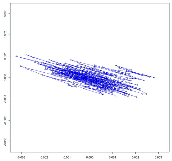 Figure 9 presents the graphical evolution of the orientation signal. Point (0, 0) corresponds to the average orientation (yaw = −176.8162, pitch = −17.0508 and roll = 109.87212). The error measurement is defined as the vector from the unitary orientation vector to the mean center orientation line.