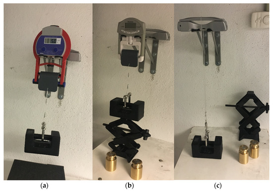 Each dynamometer was statically calibrated with the gradual application of factual loads (washers) in the center of their handles, as recommended by [32]. Other previous work to validate grip strength in normal population are presented in [37]. The weights pattern (average mass of 5.00 ± 0.0153 kgf, 49.033 ± 0.15 newton) were added one by one until they reached the final load of 60 kgf (588.39 newton), the highest force measurement limit assumed for a standard user among the three analyzed dynamometers. Figure 12 shows a scheme of the placement of the dynamometers in the cargo system, where calibration readings after the addition of each load and stabilization of the system were performed. For each load increase, the strength of the four values indicated on the dial or registration program of each dynamometer was registered.