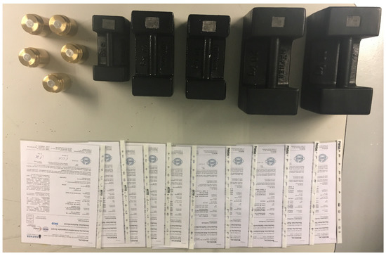 Figure 13 also shows the weights used to reach the maximum load. All weights possess the calibration certificate document that guarantees the traceability to national standards according to the International System Units (SI). Appendix A exhibits an example of the official certificate.