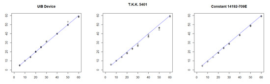 Table 1 compares the measurements of the three dynamometers. The homogeneity of the variances has been analyzed using the Bartlett test, obtaining p-values of 0.9911, 0.7674 and 0.9718, respectively, for the three dynamometers. The necessary homoscedasticity condition is fulfilled, the regression model assumptions are satisfied, and the regression line coefficients are estimated (see Table 2). In all three cases, the p-value obtained accepts the model’s hypothesis, and the error obtained is acceptable. Figure 14 shows the representation of the three regression lines. This analysis shows that the controller presented (UIB Device) has similar measurements error to the Takei model, and is below the Constant model. The Takei model is used in several studies [38] as a standard force measurement device with good performance.