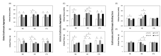 Measurement of erythrocyte aggregation. Global erythrocyte aggregation without hematocrit adjustment: (A) critical stress; (B) critical time. The repulsive force between the negatively charged cells (an intrinsic factor): (C) critical stress; (D) critical time. Cell-to-cell aggregation induced by fibrinogen (an extrinsic factor): (E) critical stress; (F) critical time. NE, normoxia training group; HE, hypoxia training group; CTL, control group; Pre, pretraining; Post, post-training; Rt, at rest; HET, immediately after HET; * p < 0.05, Rt vs. HET; † p < 0.05, pre vs. post. Values are the mean ± SEM.