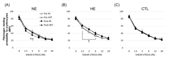 Measurement of fibrinogen binding probability to erythrocytes: (A) normoxia training group, (B) hypoxia training group, and (C) control group. Pre (white), pretraining; Post (black), post-training; Rt (circles), at rest; HET (triangles), immediately after HET; MFI, median fluorescence intensity. * p < 0.05, Rt vs. HET; † p < 0.05, pre vs. post. Values are the mean ± SEM.
