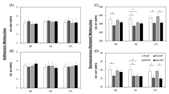 Measurement of adhesion- and senescence-related biomarkers in erythrocytes. The median fluorescence intensities of (A) CD49d, (B) CD36, (C) CD47, and (D) CD147. NE, normoxia training group; HE, hypoxia training group; CTL, control group; Pre, pretraining; Post, post-training; Rt, at rest; HET, immediately after HET; MFI, median fluorescence intensity. * p < 0.05, Rt vs. HET; † p < 0.05, pre vs. post. Values are the mean ± SEM.